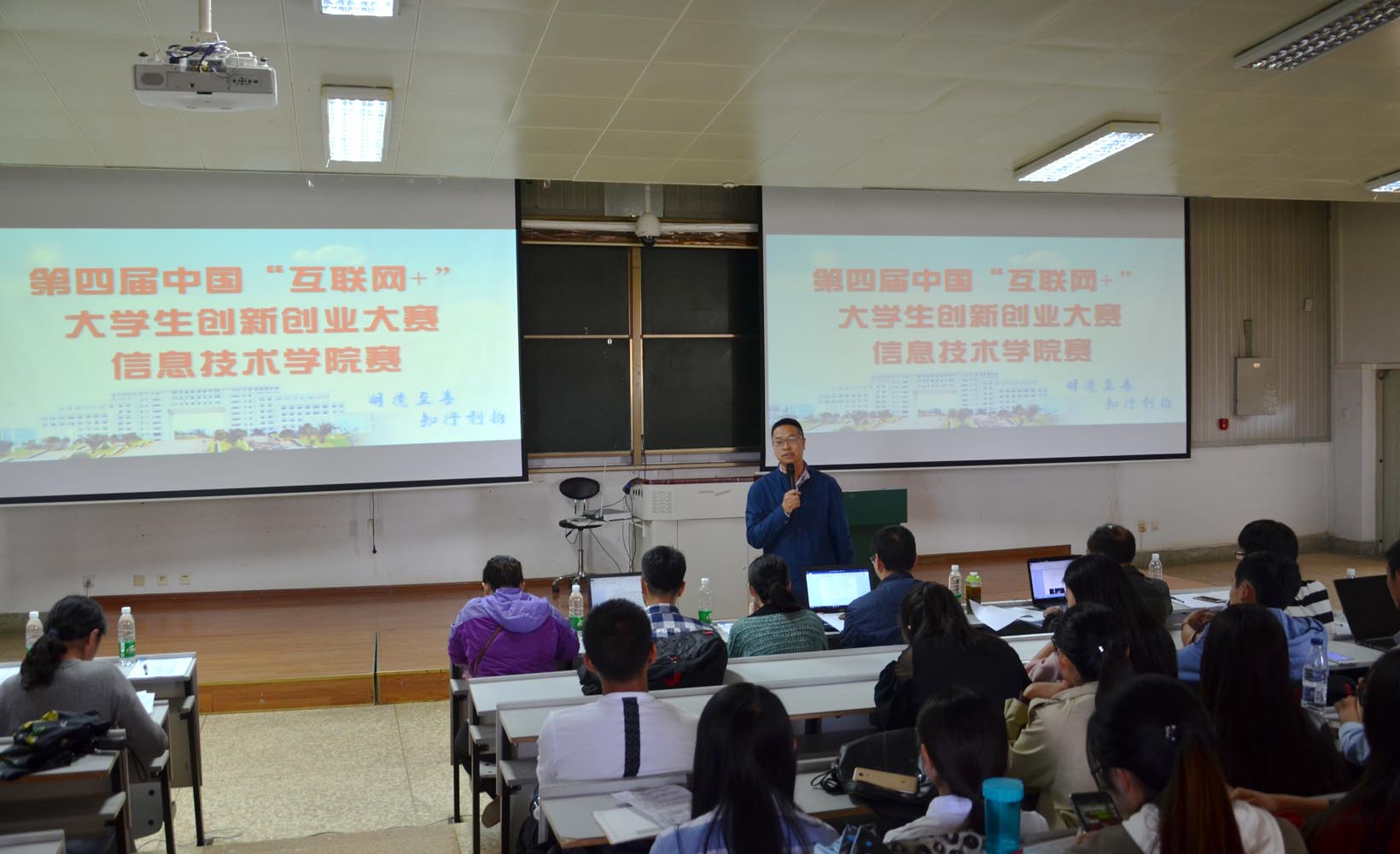 4月13日,为营造创业文化氛围,激发当代大学生的创业热情,提高信息学子的创业技能,扎实推进信息技术学院创新创业教育和大学生自主创业工作。信息技术学院在博识楼2003举行了第四届中国“互联网+”大学生创新创业大赛信息技术学院赛,34支队伍参加此次比赛。信息技术学院党总支书记陶军、院长刘渝妍和各位评委老师参加活动,比赛由学院团总支学生会学术科技部李闰兰、胡洋同学主持。