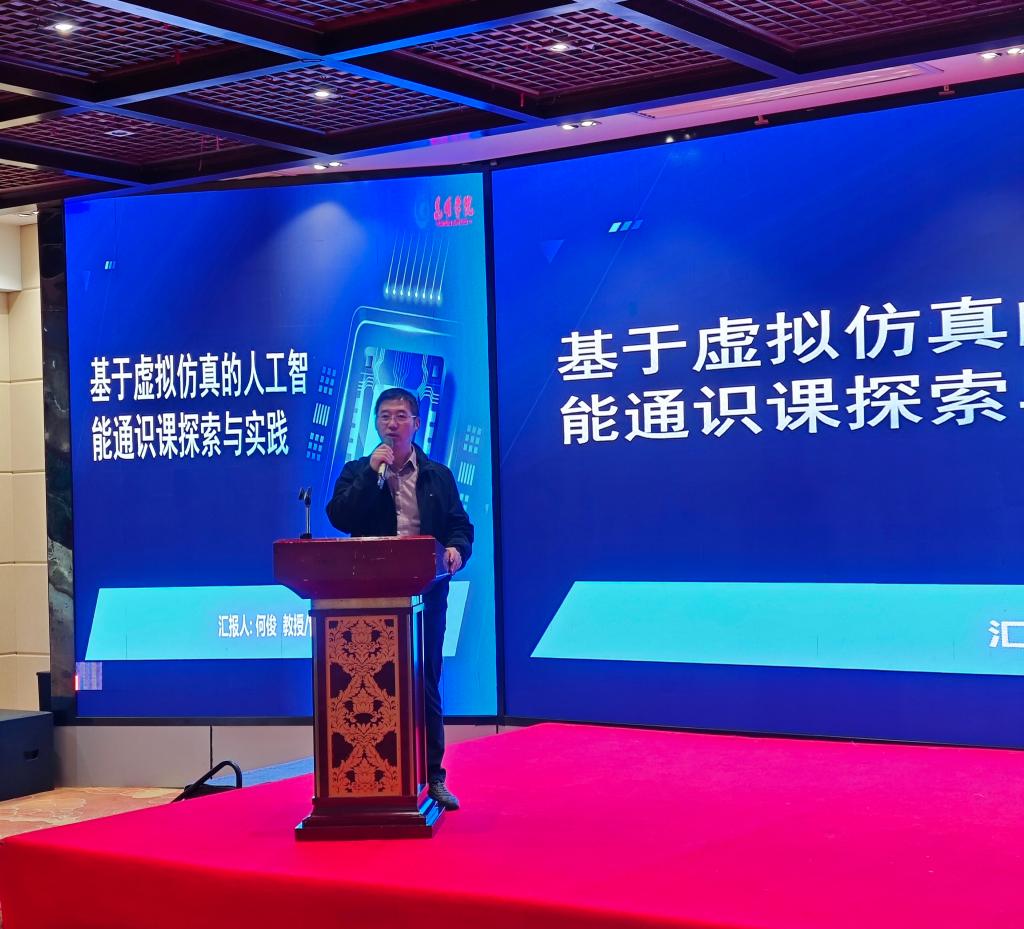 研讨会期间,来自山东大学、华中科技大学和南京大学等多所高校的AI教育领域知名专家学者带来了高水平主旨报告,分享前沿研究成果与院校实践案例。何俊院长以《基于虚拟仿真的人工智能通识课探索与实践》为题,介绍我校人工智能通识课开设情况,深入剖析传统AI通识课面临的痛点,展示虚拟仿真技术在降低AI实验教学门槛、提升学生实践能力方面的显著成效。